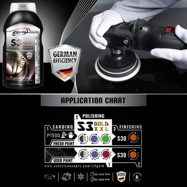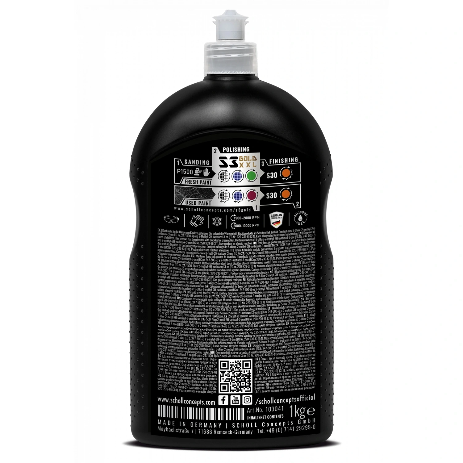 S3 GOLD XXL, Scholl Concepts tarafından geliştirilen yüksek performanslı rubbing compound formülüdür. Özellikle sert ve aşınmış boya yüzeylerinde olağanüstü kesim gücü sunarken, mükemmel parlaklık sağlar. Tek adımda derin çizikleri, oksidasyonu ve zımpara izlerini (P1500’e kadar) kolayca giderir.